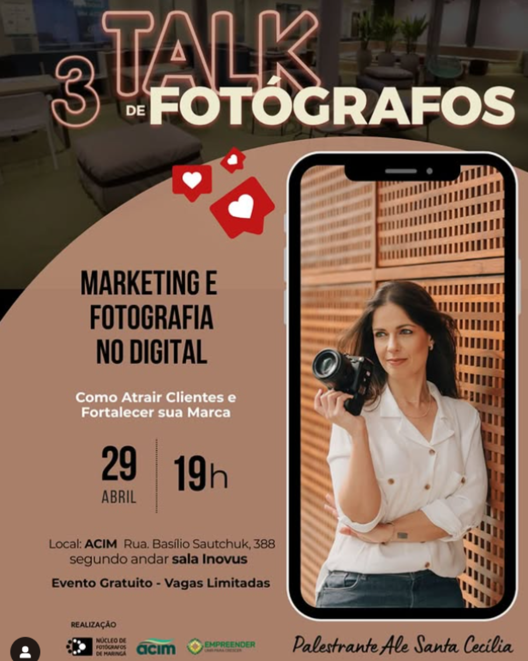 Vivemos uma era em que a fotografia deixou de ser apenas um registro e passou a ser uma ferramenta poderosa de conexão e marketing. Mas, em um mundo onde todo mundo tem uma câmera no bolso, como se destacar? Como transformar talento em um negócio sólido e atrair clientes fiéis? Essas são algumas das perguntas que o Núcleo de Fotógrafos de Maringá pretende responder no próximo dia 29 de abril, em um TALK imperdível com Ale Santa Cecília.